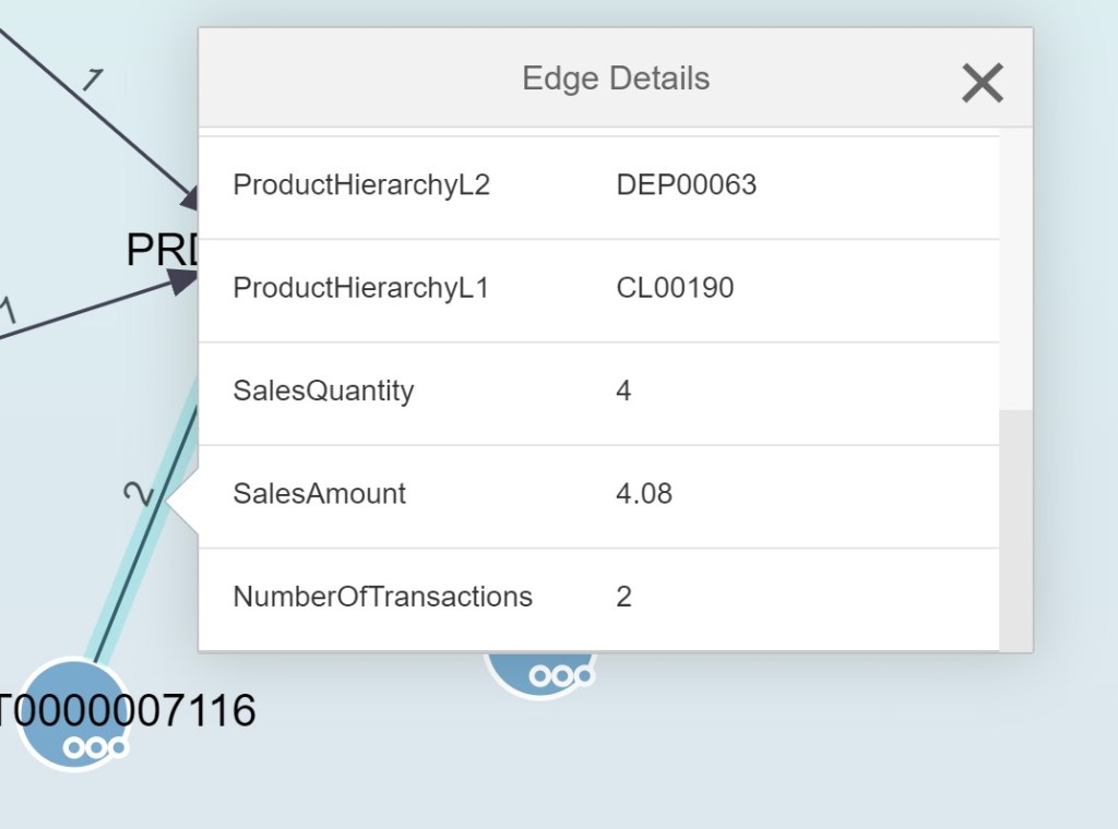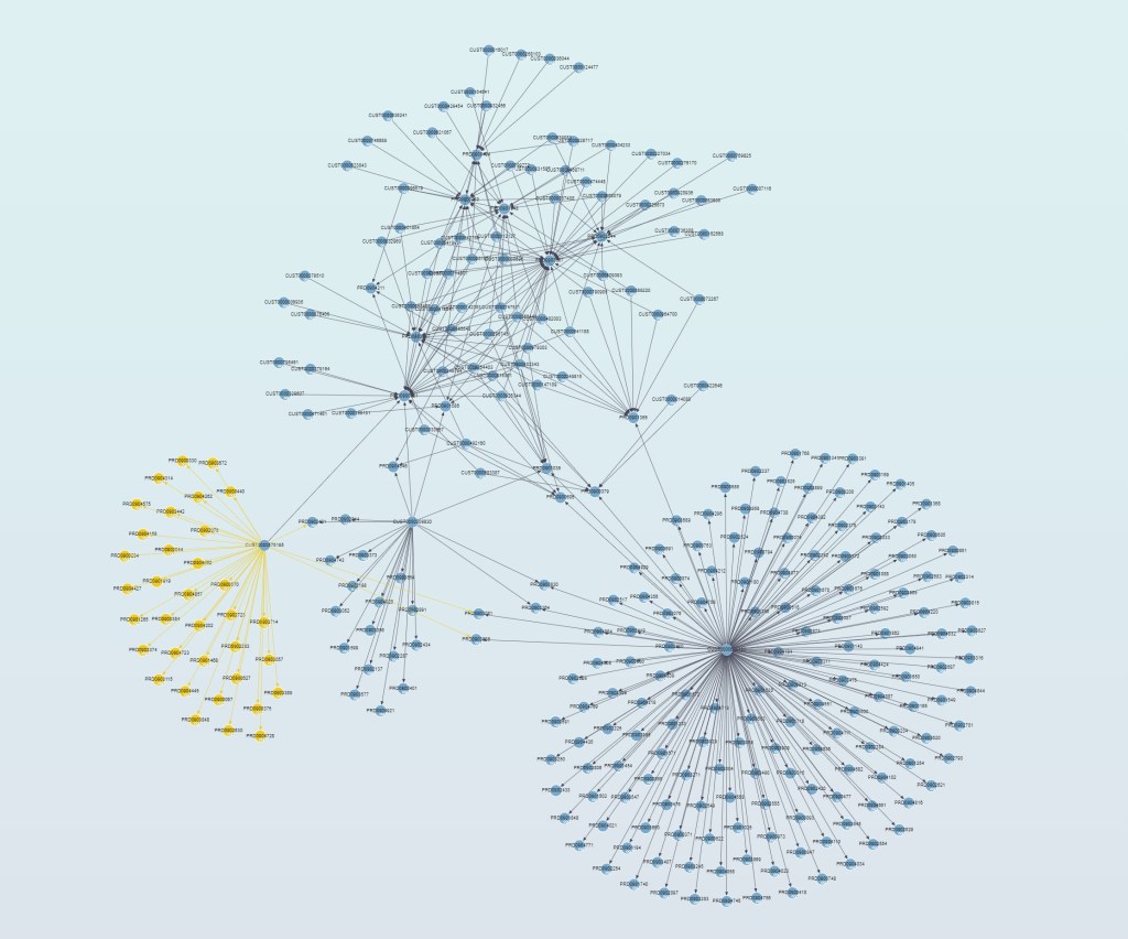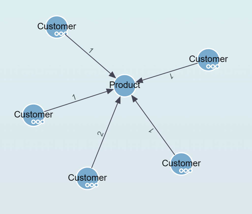 Tenemos nodos de tipo cliente que han realizado la compra de un mismo producto. Las relaciones entre los nodos muestran el numero de transacciones o compras realizadas por cada uno.
