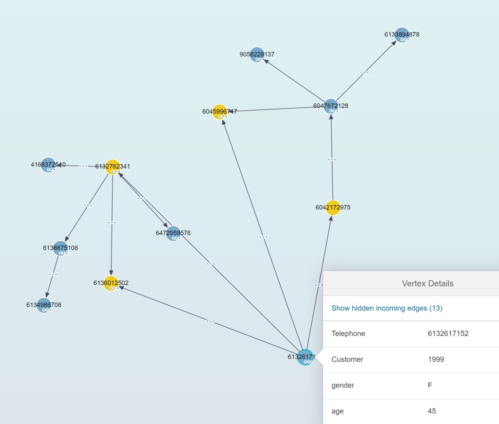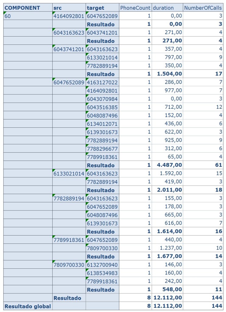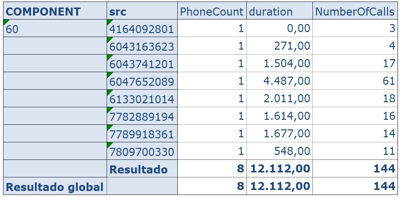 Combinando en Hana el resultado del algoritmo con los datos origen (registro de llamadas y datos maestros) podemos saber por ejemplo que números conforman este grupo, duración y número de llamadas.