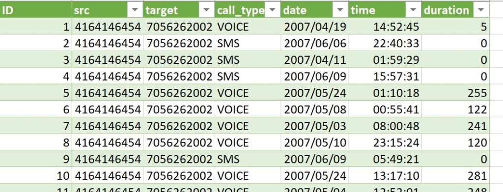 Al contrario que en los dos primeros posts, donde trabajamos con un dataset basado en ventas, en este, me he decantado por uno que tiene relaciones bidireccionales, es decir, de un nodo A hacia un nodo B y viceversa; concretamente un registro Call Data Record donde se recogen registros de llamadas telefónicas, duraciones, tipo de llamada, etc. Los datos provienen de los ficheros demo que trae de serie la herramienta SAP Predictive Analysis para el escenario de Social Network Analysis (SNA).