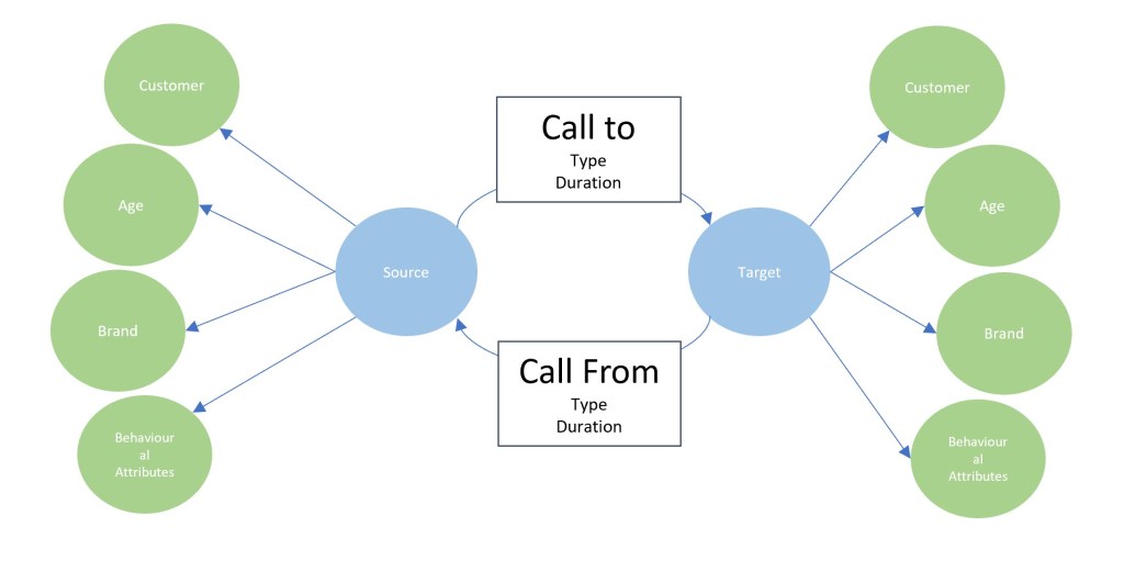 Tenemos nodos origen y destino que se relacionan entre sí a través de contactos, de tipo llamada, sms, etc. con cierta duración, en cierta fecha y hora.