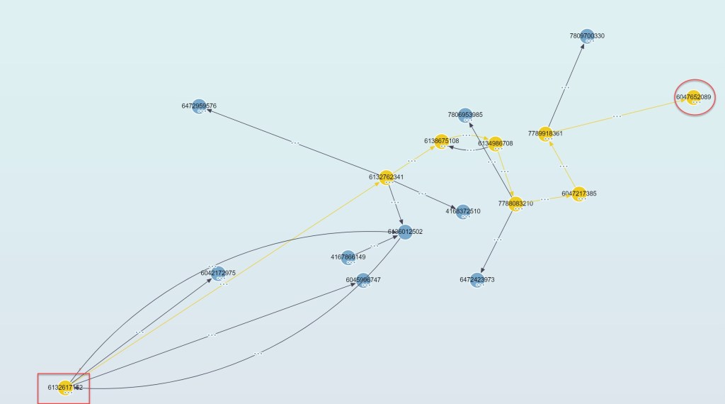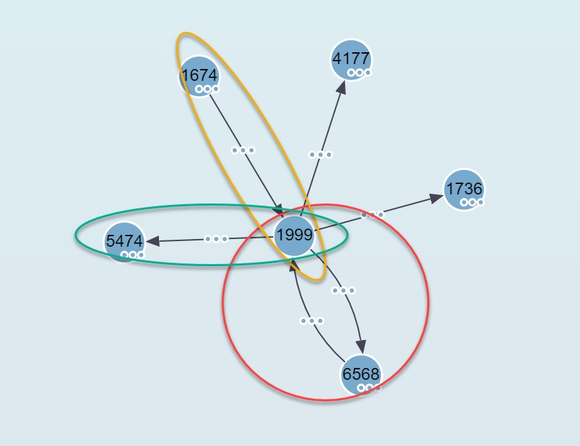 Si le echamos un vistazo a los datos, podemos observar, en rojo conexiones bidireccionales entre el nodo 1999 y el 6568, en amarillo entrantes desde el 1674 al 1999 y en verde salientes desde el 1999 al 5474.