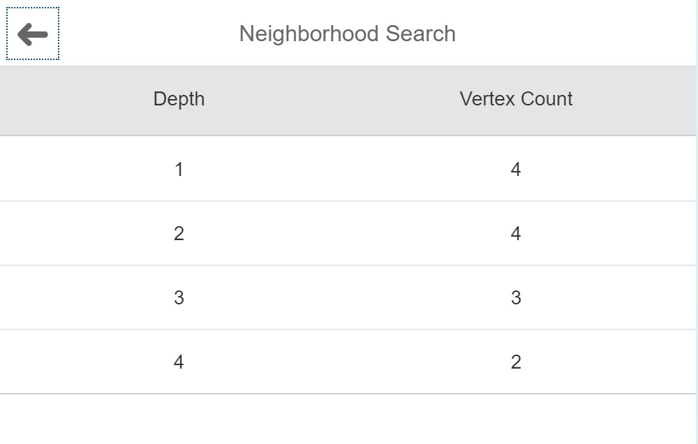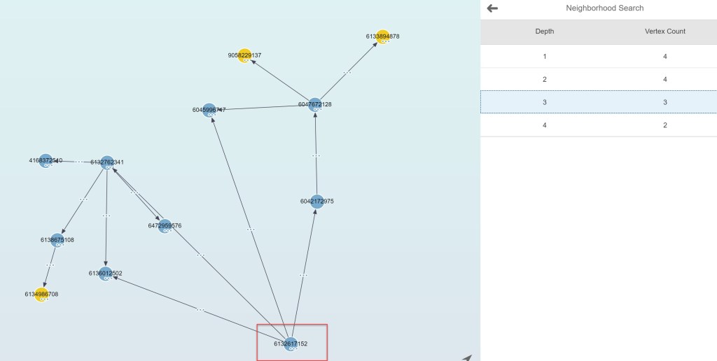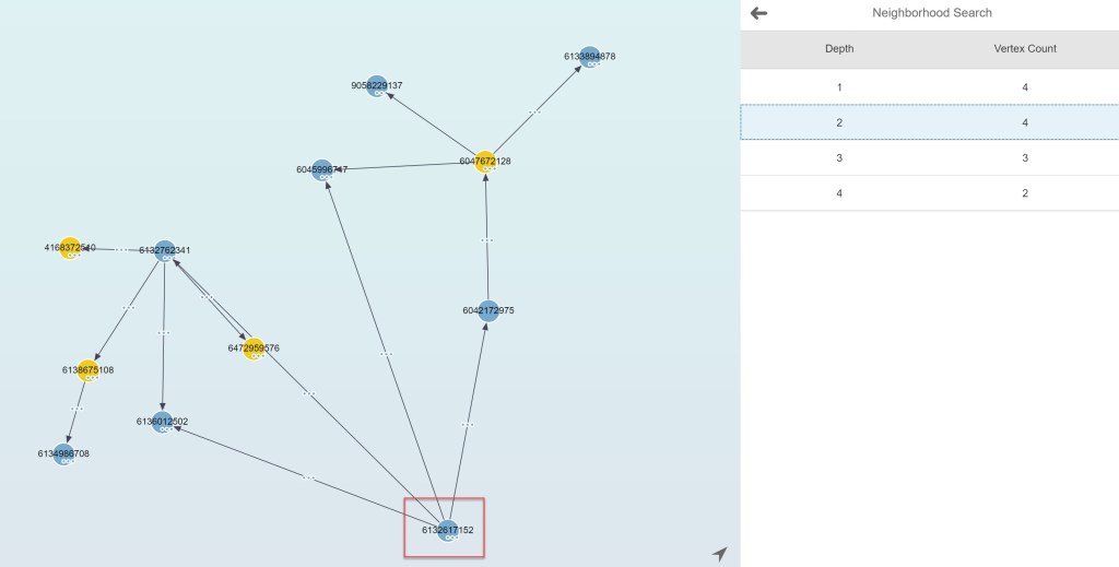 Para ver un ejemplo tomamos como referencia un nodo fuente y el algoritmo nos devuelve todos aquellos nodos salientes, entrantes o ambos con la profundidad indicada. Si indicamos una profundidad por ejemplo de 1 a 4, el resultado es el siguiente: