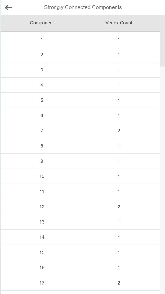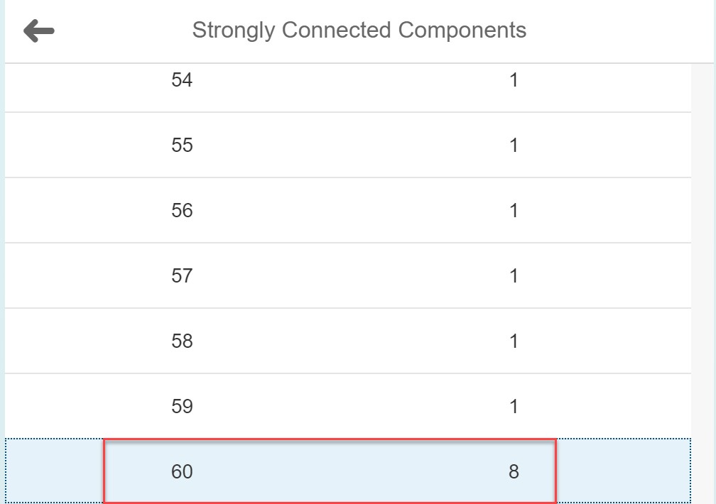 Este algoritmo nos devolverá agrupados en componentes los ID de los nodos que están “fuertemente” conectados entre sí, es decir, todos aquellos nodos que sean alcanzables desde cualquier nodo perteneciente a ese componente. Ejecutando el algoritmo sobre nuestro dataset obtenemos los siguientes resultados.