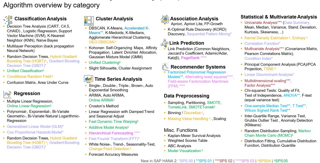 La evolución del número y categoría de los algoritmos a través de las diferentes versiones de HANA pueden verse en la siguiente imagen: