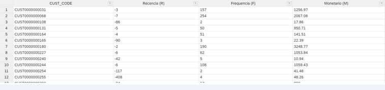 Una vez ejecutado el proceso correctamente el aspecto qué tiene la tabla donde ya tendremos todos los clientes perfectamente categorizados con cada uno de los intervalos es el siguiente.