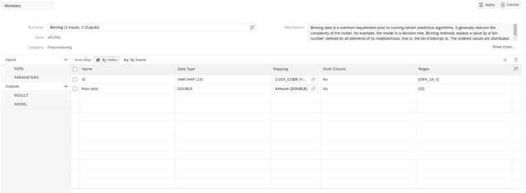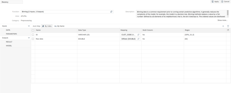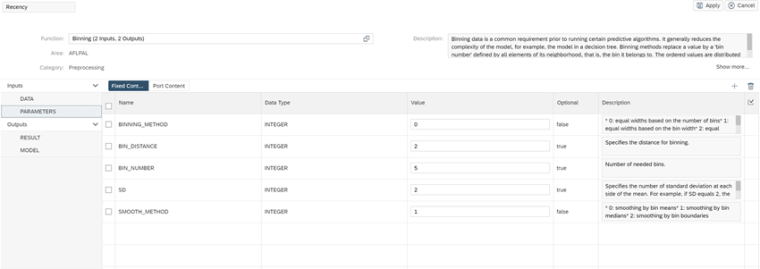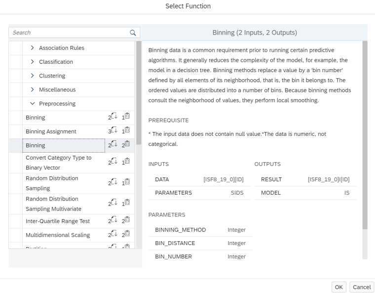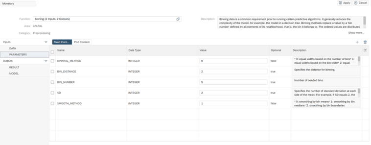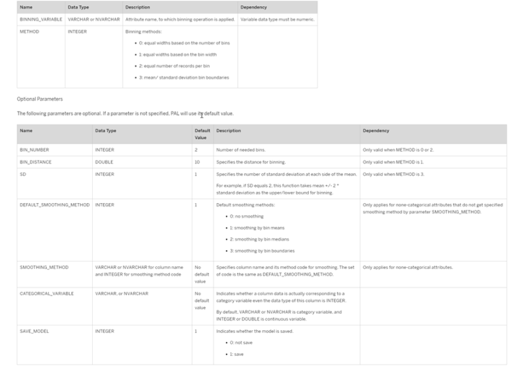 Sin embargo, como parte del ejemplo de este post, lo que vamos a hacer en lugar de definir una serie de intervalos manuales es definirlos empleando los algoritmos disponibles en el PAL de Hana, en particular emplearemos el algoritmo de Binning o discretización.