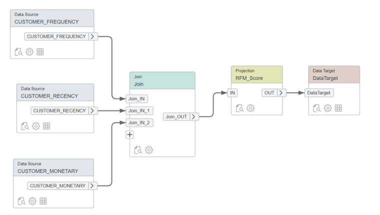 Cómo pasó final hemos implementado un último flowgraph que será el encargado de unir la R la F y la M calculadas previamente y persistirlas en una tabla en Hana.