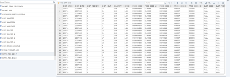El modelo de datos del que partimos tiene un conjunto de tablas donde una de ellas contiene los datos transaccionales de los tickets de venta a nivel de posición con el producto vendido y otras actúan como tablas de datos maestros (atributos y descripciones). En nuestro ejemplo trabajaremos con un total unos 31 millones de registros de datos transaccionales, 5.000 productos y 50.000 clientes.