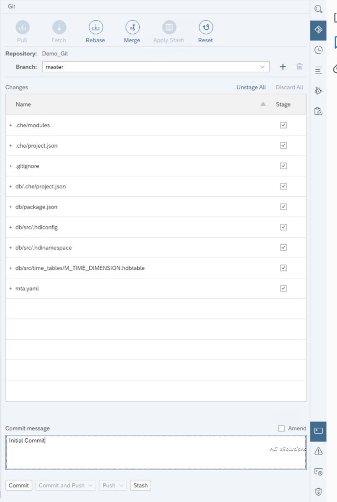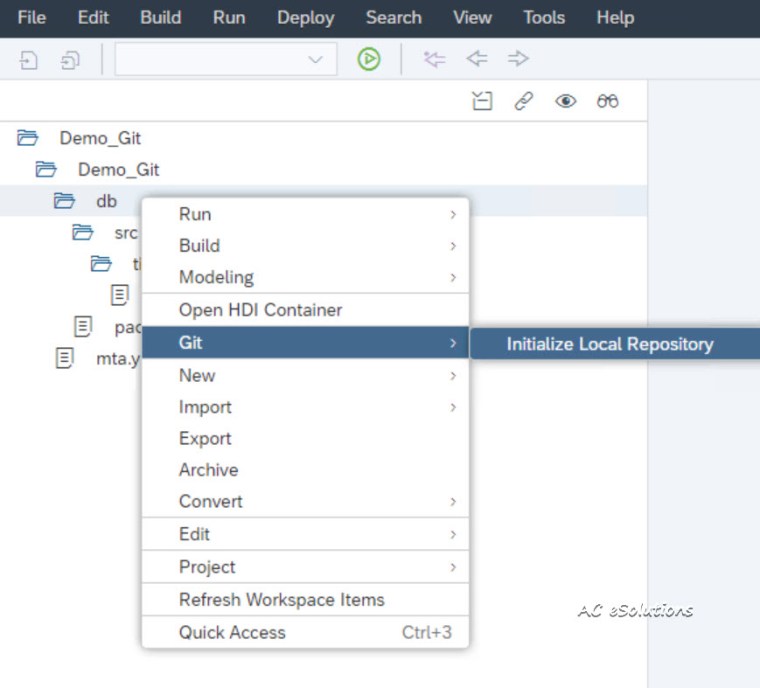 En nuestro ejemplo y como punto de partida arrancamos sobre un proyecto de tipo HDB (Hana Database Module) y lo primero que debemos hacer es activar la sincronización con nuestro repositorio local Git.