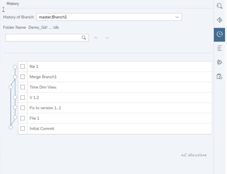 En este ejemplo he creado una rama denominada Branch 1 a partir de la master y hemos ido creando objetos de forma paralela y realizando sucesivos commits en ambas ramas, como paso final hemos realizado un merge para fusionar los objetos de la Branch1 con los existentes en la master. El aspecto que presenta el histórico de pasos es el siguiente.