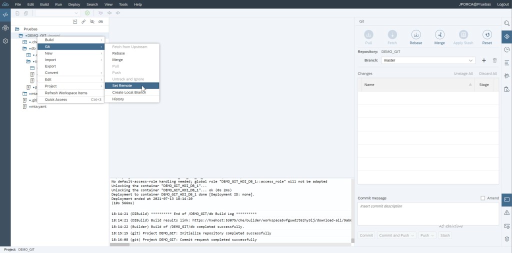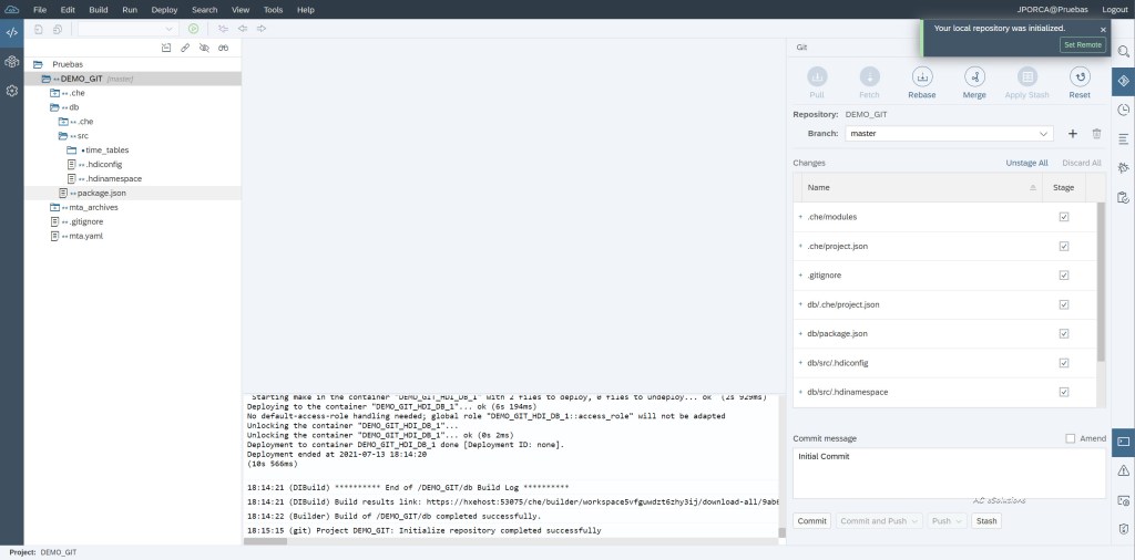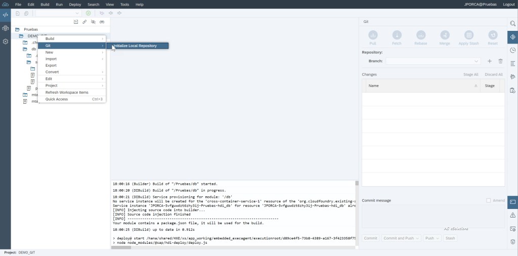 El siguiente paso será desde la herramienta Web IDE for Hana crear un proyecto e inicializar el repositorio local.